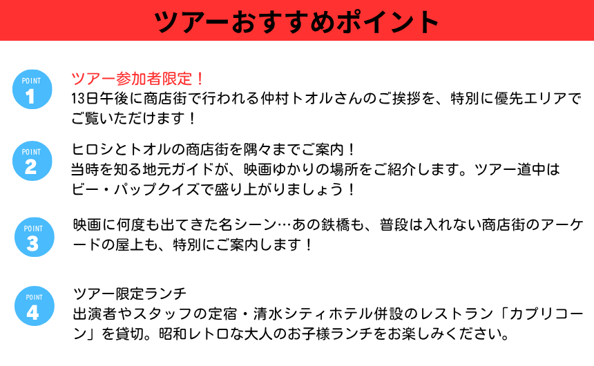 ・清水銀座商店街で行われる仲村トオルさん登壇イベントは、全席立ち見となります。本ツアーでご案内するエリアも立ち見となりますので、ご注意ください。