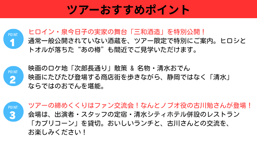 映画の撮影を行った清水駅前銀座商店街をはじめ、印象的なシーンの撮影スポットを巡る聖地巡礼ツアー第2弾!通常一般公開されていない酒蔵の見学や、サプライズゲストとのランチタイムなど、特別企画が盛りだくさんです!