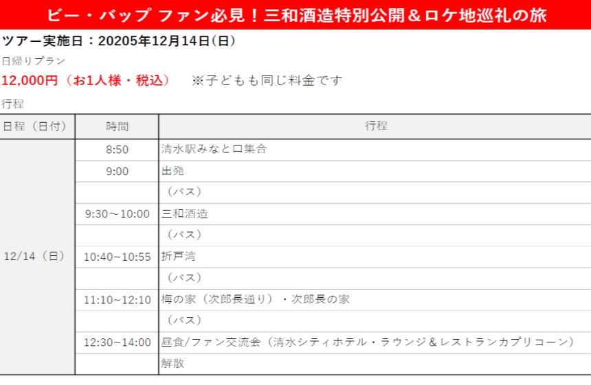 清水駅みなと口集合/出発==(バス🚌)==三和酒造==(バス🚌)==折戸==(バス🚌)==梅の家(次郎長通り)・次郎長の家==(バス🚌)==昼食/ファン交流会(清水シティホテル・ラウンジ&レストランカプリコーン)昼食後解散