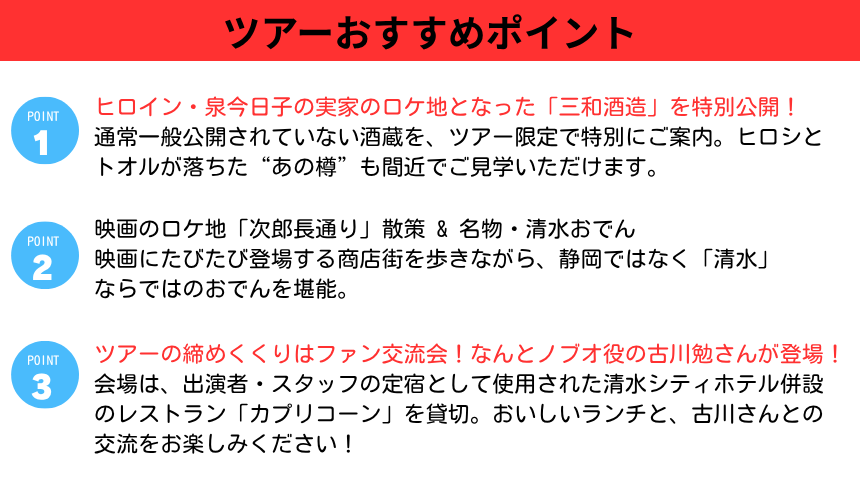 映画の撮影を行った清水駅前銀座商店街をはじめ、作中の印象的なシーンの撮影スポットを巡る聖地巡礼ツアー第2弾!通常一般公開されていない酒蔵の見学や、サプライズゲストとのランチタイムなど、特別企画が盛りだくさんです!